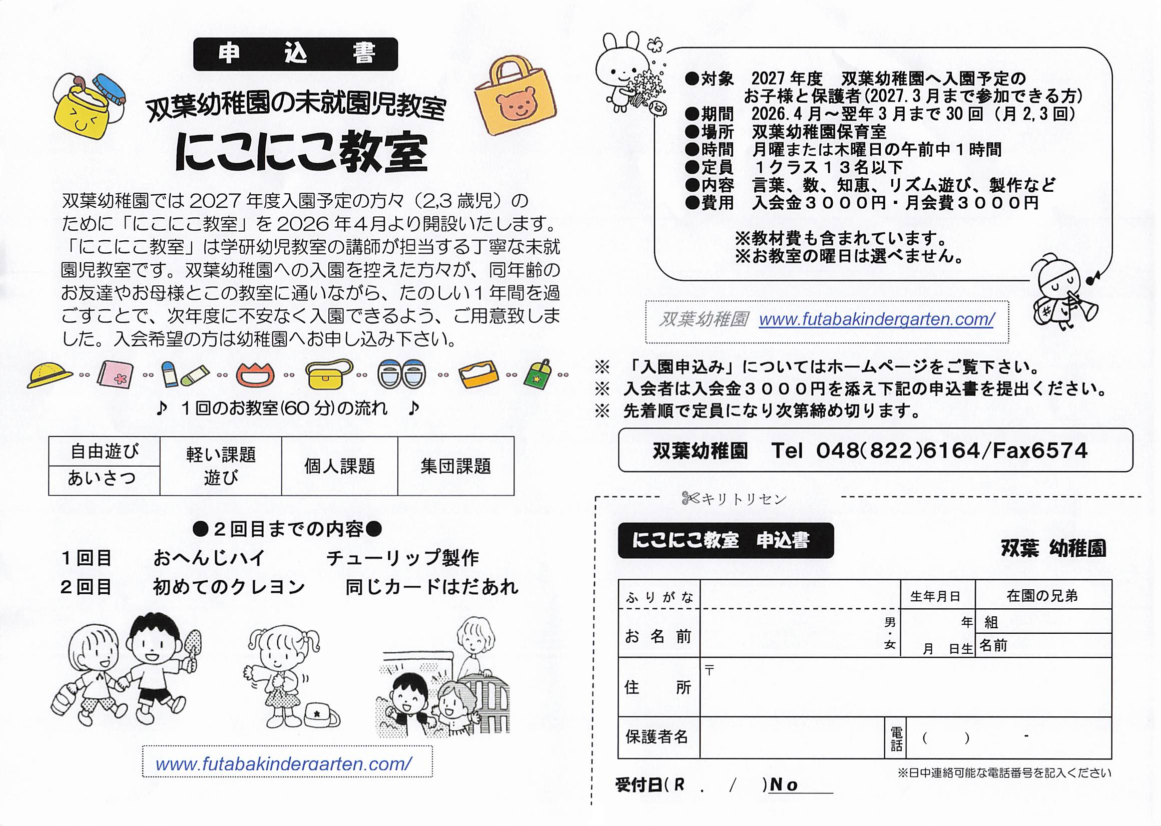 - 未就園児教室は双葉幼稚園への入園準備となる教室です。(令和9年度幼稚園入園者向けの教室となります)